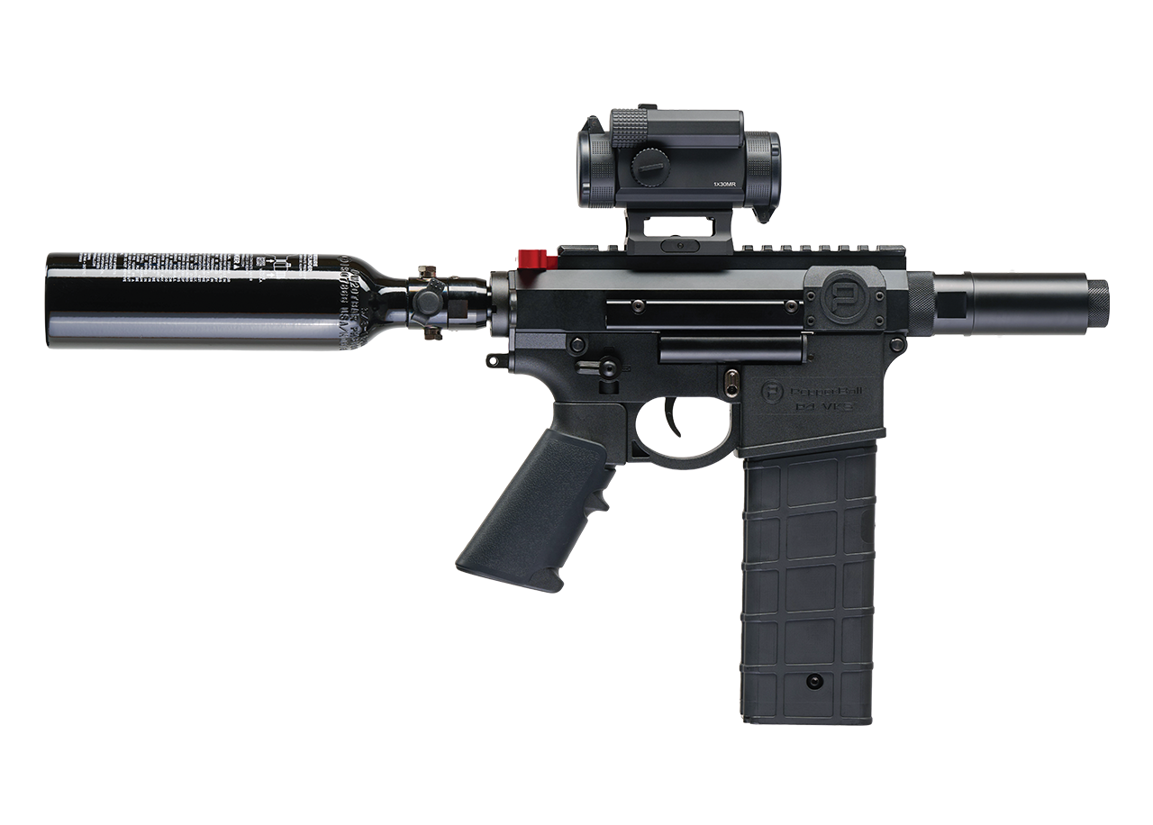 PepperBall® VKS PHANTOM™ – Black – Qty 2 black 10-round magazines with covers, 13cu 3000psi Aluminum HPA Tank, 12 g Piercer, Qty 2 88g adaptor and Qty 1 88g sleeve, Green Dot Optic, Black Silicon textured grip, soft case, Non-Lethal patch, product manual, spare o-rings, and Allen keys.